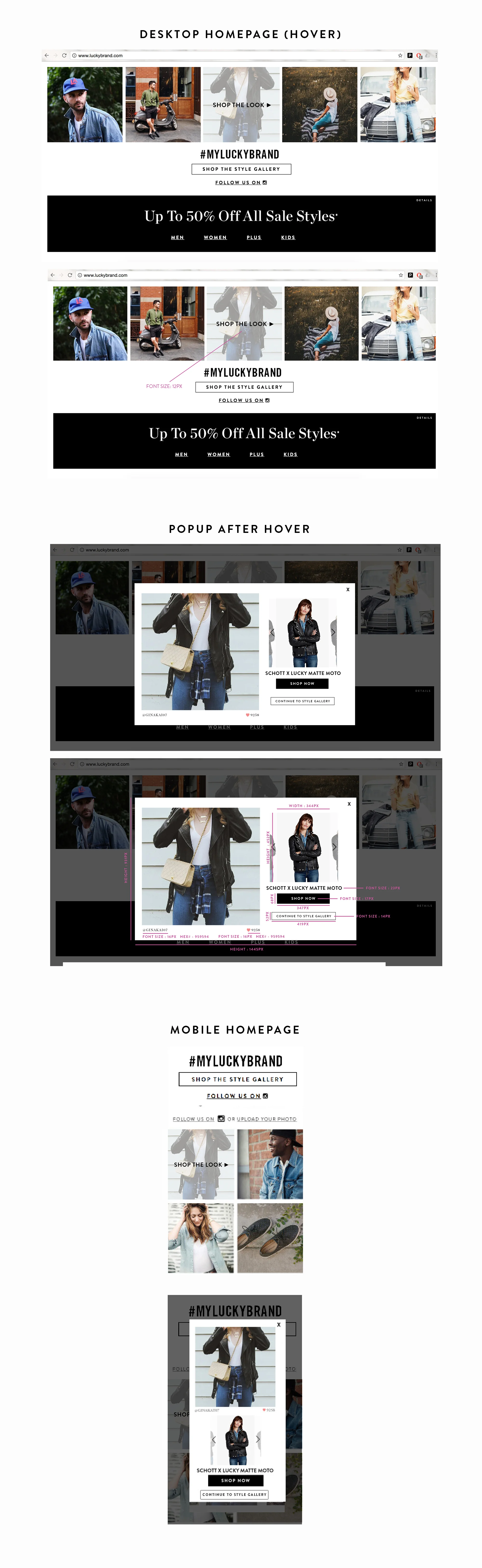 Planned and re-designed Lucky Brand's social media portion of their website. Continuing along the lines of simplicity and a user friendly application, a mouse hover was created as well as a pop-up for increased engagement. The designs are desktop and mobile friendly.